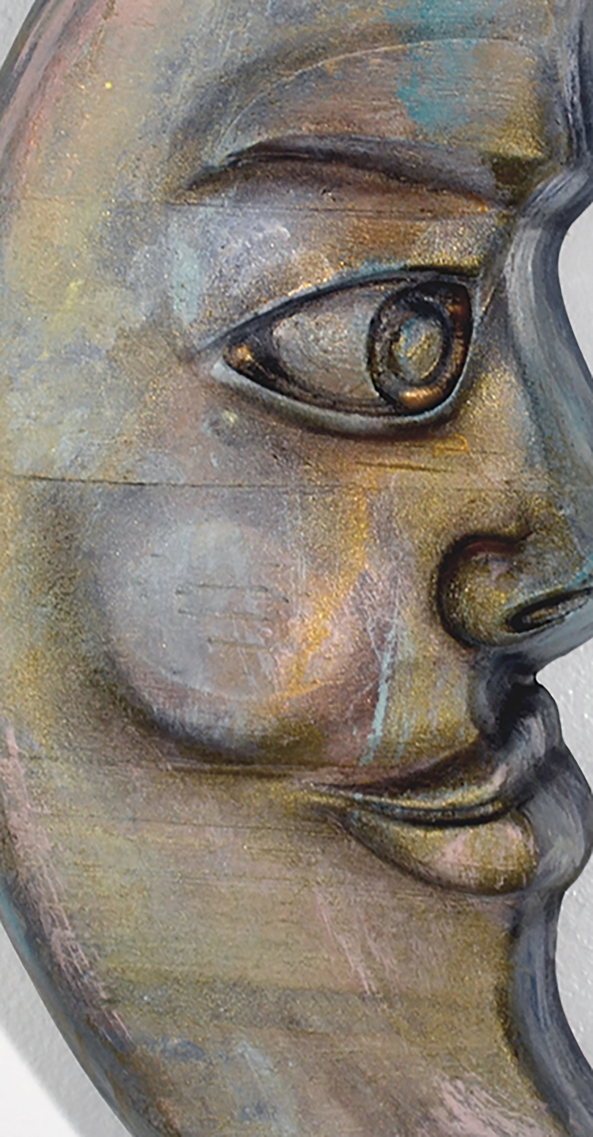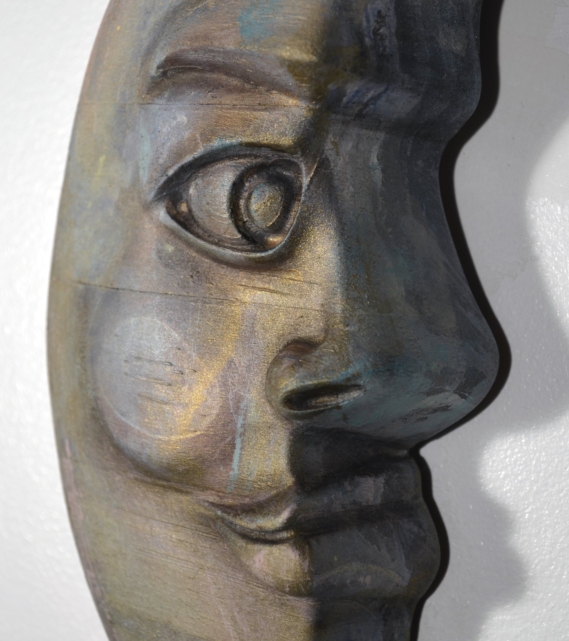 Crescent moon face hand painted 3d wood carving, wood wall art, vibrant and bold wood wall art ready to hang
