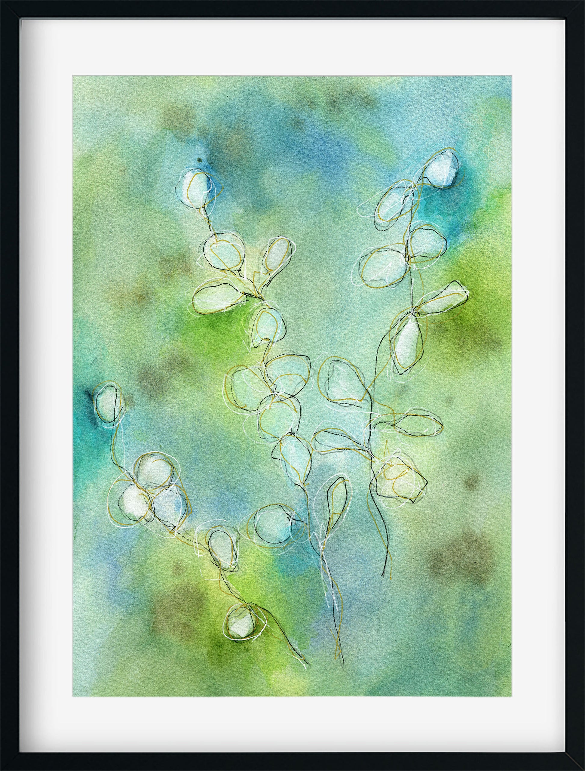 Green and blue eucalyptus hand painted watercolor painting. Line and wash botanical original painting on paper.