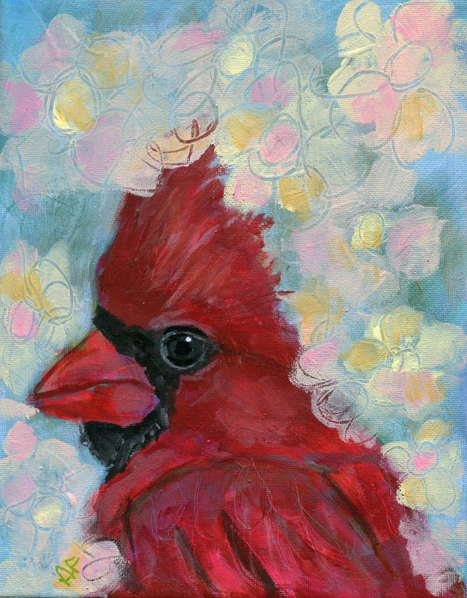 Red Cardinal in flowers painting on canvas 8x10