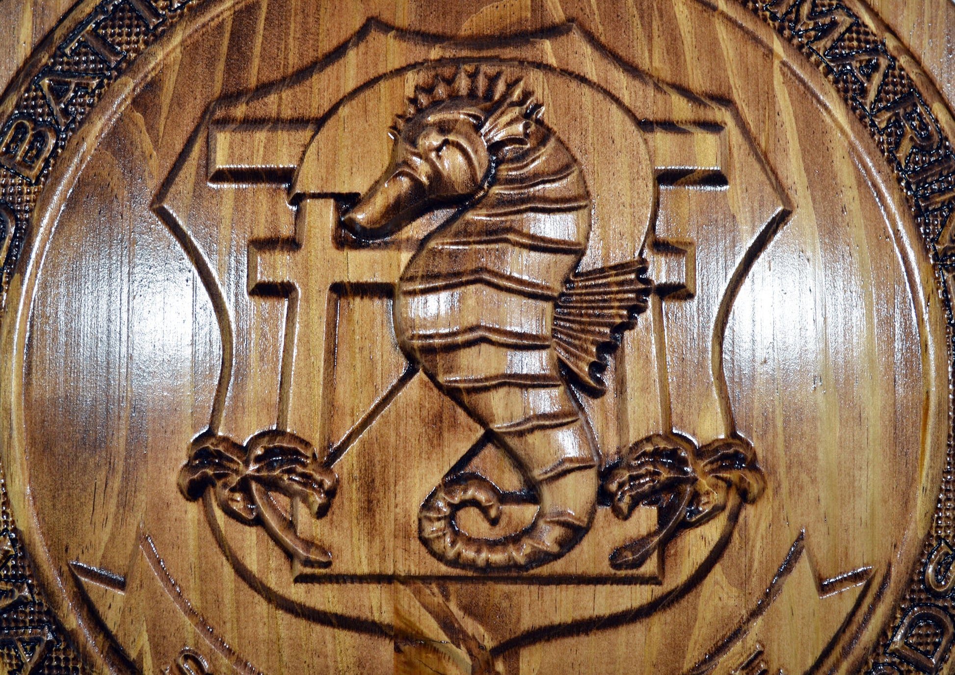Can be stained darker/lighter or just finished in mineral oil, contact me for changes. Can also be finished in General Finishes Bronze Pearl glaze. Finish can be seen on Eagle Globe Anchor symbol.